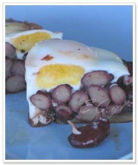 大蘑菇1个,有机熟红芸豆罐头0.2个,鸡蛋1个,橄榄油适量,盐适量