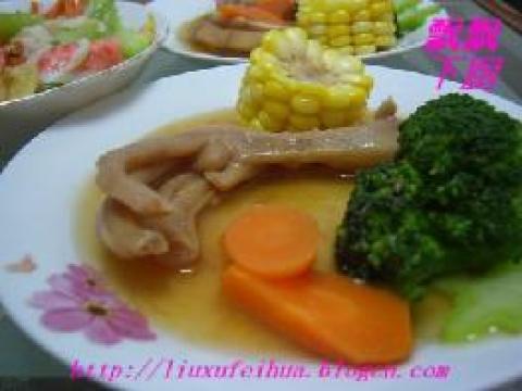 2、调料调成鲍汁,把猪蹄放鲍汁内,上笼蒸至酥糯。