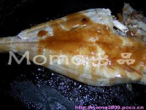 2、倒掉煎鱼的油,然后下牛油、柠檬汁(可下少许白葡萄酒或水)煮开后,以盐、胡椒粉调味,放回鱼,让其均匀吸取汁酱便成。