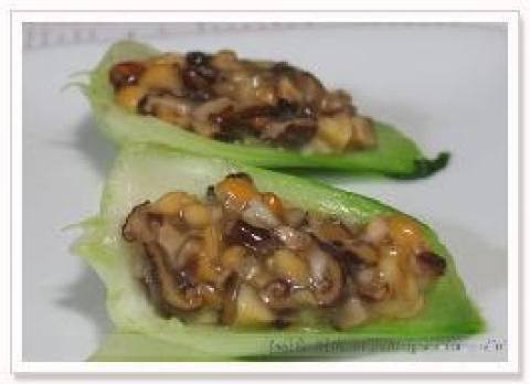 4.把香菇腰果汁分放在油菜叶子上就可以了。吃的时候还可以滴几滴香油。