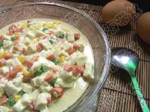 鸡蛋,水,盐,青豆,胡萝卜丁,玉米,火腿肠丁,嫩豆腐