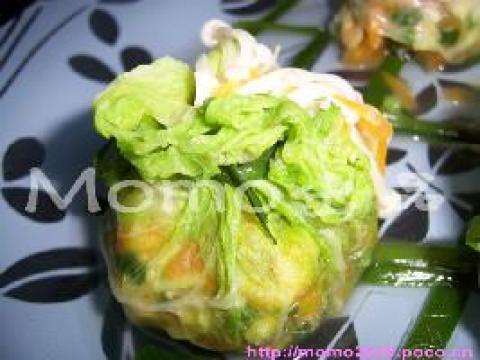 4.用大白菜叶将馅包好,用焯熟了的韭菜作绳子绑好。