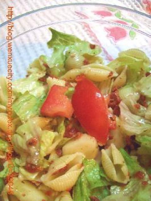 2.西生菜用手撕成小块,黄瓜、洋葱,西红柿切粒或块,放入大盘里,加准备好了的意粉,放沙律酱(我放的是(sun dried tomato vinaigrette with roasted red peppers dressing,微辣、微酸,好好味,易引起食欲),再加些bacos chips,脆脆的,全部放在一起搅拌均匀,ok。