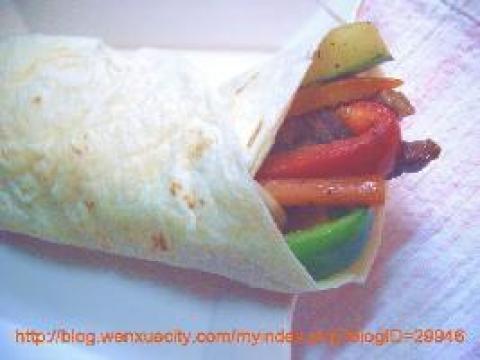 牛柳、洋葱丝、红灯笼椒丝、绿灯笼椒丝、黄瓜丝、红萝卜丝;(材料可按自己喜欢的配),玉米薄饼(美国的grocery store 有售)。