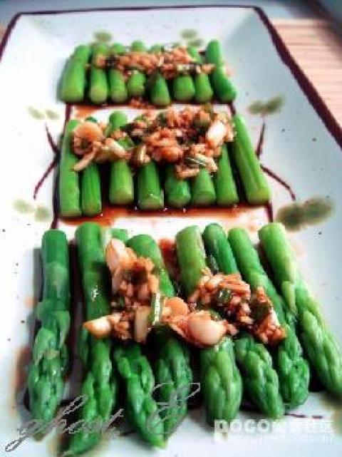 2.把蒜末、葱末、生抽、麻油、鸡精、辣油调成的酱汁烧热后淋在芦笋上。
