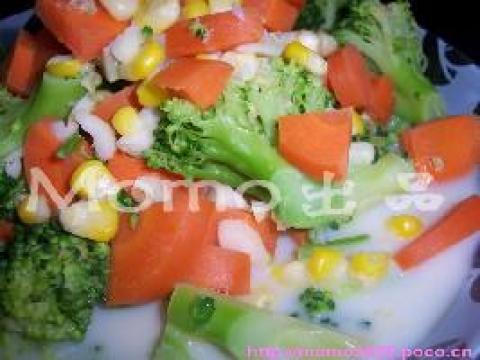 4.锅内放少量油,烧热后加入玉米和红萝卜,翻炒后加入西兰花炒匀。