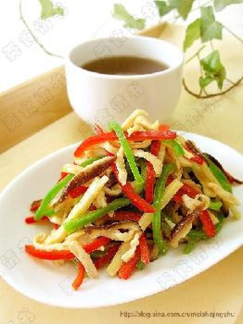 5.锅内留底油,放入葱姜丝炒香,然后放入冬笋丝和香菇丝翻炒一会,再放入青红椒丝和鸡肉丝,煸炒片刻,加入芡汁炒匀,待芡汁熟透后,淋入明油即可。