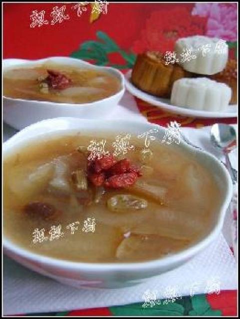 这道甜羹,桂圆、蜜枣、葡萄干都象征着团团圆圆、甜甜蜜蜜、吉祥如意;藕粉则是祝福阖家融融乐乐,亲密无间;本来应该撒上点红绿蜜饯丝预祝生活五彩缤纷的意思,我家里没有,也不喜欢吃,就没加,放了几粒枸杞装饰一下好了,也没必要只为了拍照好看,满世界去找红绿丝了。 同时这道羹还有药膳的功能,因为秋季人体心气烦躁,学要泻心火润腑脏,而梨是最好的润肺生津的水果,而蜜枣和桂圆更是滋补佳品,藕粉则有生津清热、养胃滋阴、健脾益气、养血止血之功效,对老幼都是非常理想的食品。中秋以后,正是人体滋补养的最好时机哦,别错过。