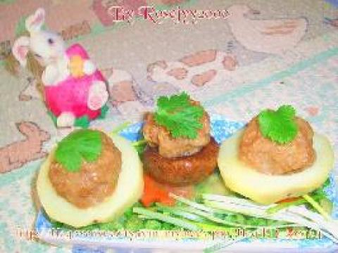 四、蒸大概15分钟左右,蒸好后将蘑菇和土豆转移到有豆豆的碟的上面,拿起肉球过过油,再放回土豆和蘑菇的洞中,再浇上用鸡精、淀粉和盐的兑成的玻璃芡。
