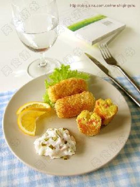 6.锅烧热后放入少许色拉油,油热后放入做法5的土豆,用小火煎至金黄色后捞出即可。食用时可搭配沙拉酱,也可在沙拉酱中放些火腿丁和酸黄瓜丁来增加味道。