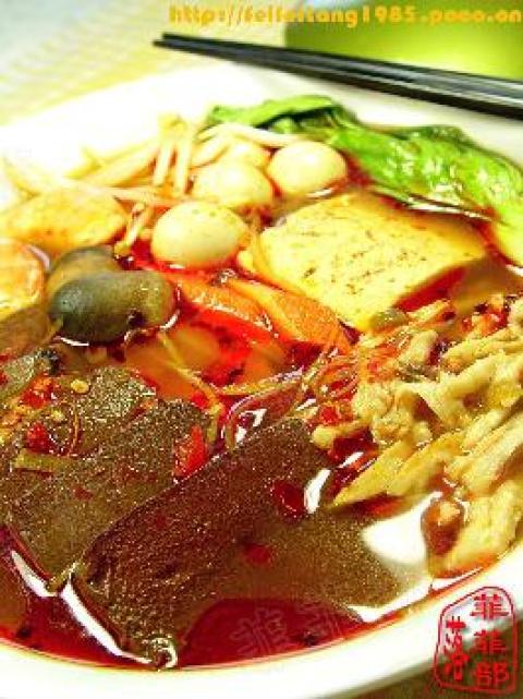 银针粉,血豆腐,鹌鹑蛋,白豆腐,草菇,鸡肉,蟹肉棒,虾,油麦菜,豆芽,葱姜,郫县豆瓣