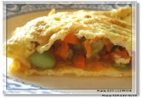 5.把先前炒好的材料码放在蛋皮上,再小心将蛋皮对折,成为半圆形状,即可。