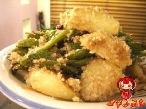 其实在炸豆角的时候可以将土豆也加进去炸,最后蒸的时间稍短也一样好吃。