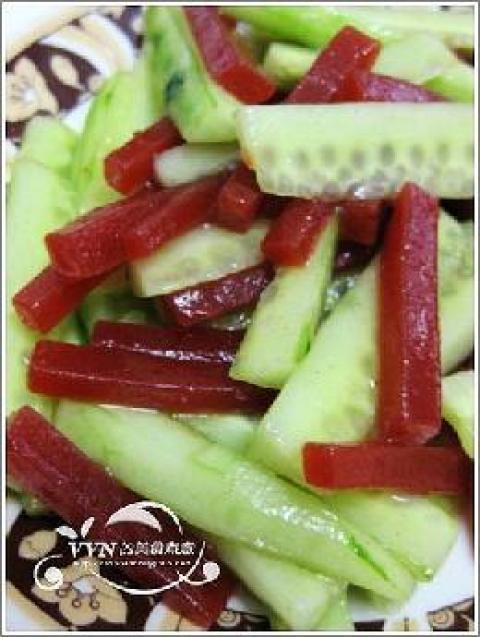 2.做法:黄瓜去皮切条,山楂糕切条,放少许白糖白醋拌就ok了~