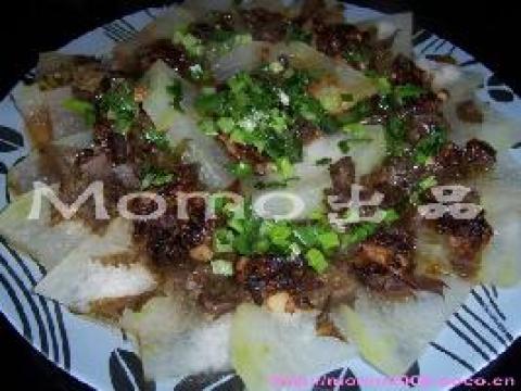 3.将冬瓜片铺在碟上,在上面再放上紫苏叶丝及豆豉蒜酱。