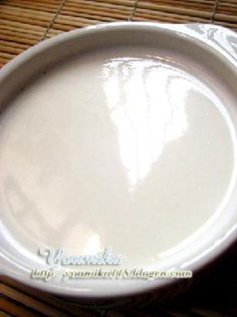 2.再将牛奶加入拌匀,用小火加热,须不停地搅拌以防止焦底,煮至浓稠状时即可离火,待稍凉时备用。