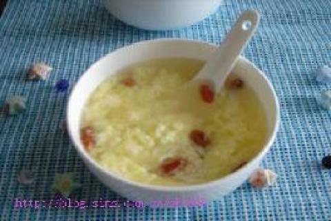 4.煮至飘出香味时倒入蛋液,加糖、枸杞,蛋液起蛋花时即可