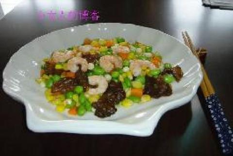 5.锅内放油,放所有材料翻炒,放虾仁、放盐、糖、鸡精翻炒即可