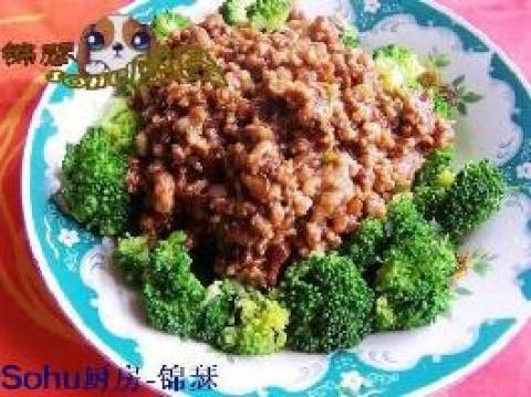 3.然后把肉末用葱蒜末炒一下,加炸酱,勾芡,淋到西兰花上即可。