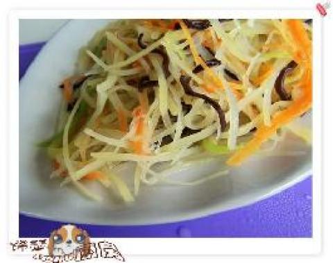 4.土豆丝有点偏干,中途可以加一点开水,然后按:胡萝卜丝、木尔丝、莴苣丝的顺序把配角扔进去,加盐、白醋,哈哈,可以吃喽!