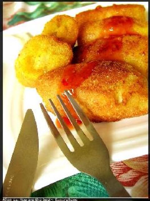 4.秉承本人一贯省油的习惯~我还是选择煎而非炸~起锅子,先烧热锅子再放入油,温火煎香蕉段(注意:一次不要放多2-5段香蕉就可以,油温是关键,火大了会焦,火小了会掉外层皮)。取出后用吸油纸去下表层油~最后可以淋点酸甜口味的果酱或者蜂蜜~