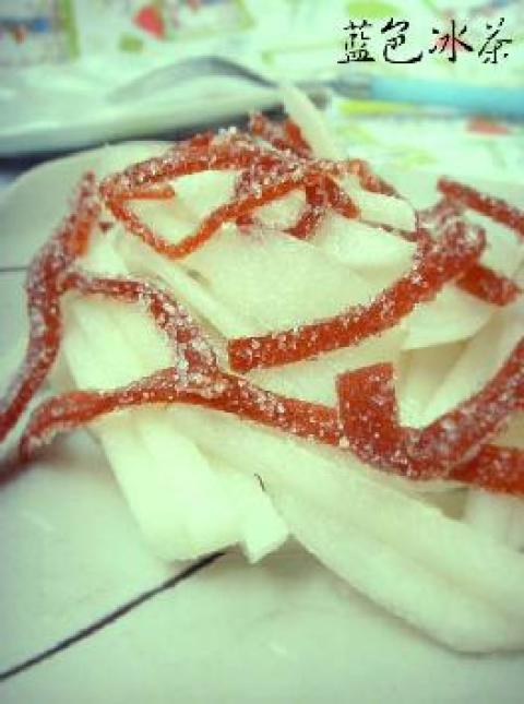 1、梨洗净切丝;山楂洗净,切成厚0.2厘米的片;西瓜肉切成与梨丝相同的丝。