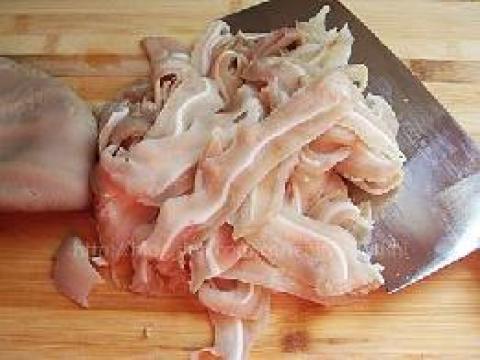 1、将猪耳洗净,加入清水锅上火烧沸,将猪耳汆透后捞出放在盆内,加适量精盐、味精、料酒、胡椒粉、清汤,上笼蒸1小时后晾凉切丝待用。