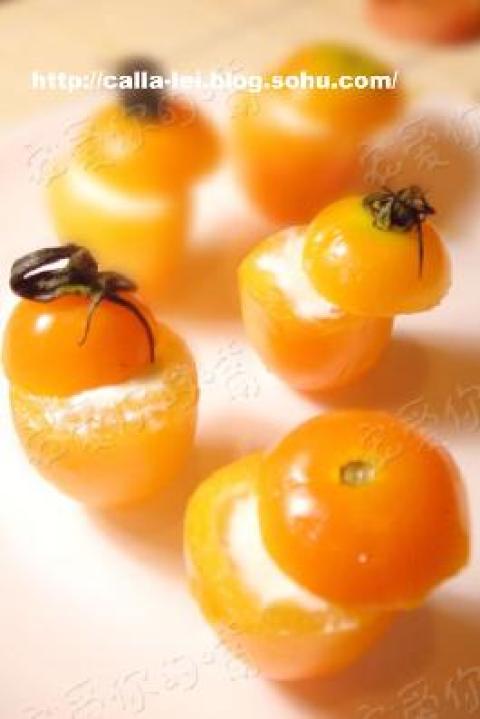 4.把打发的奶油填入樱桃番茄中。好了。拈一颗放入口中,不知怎么,突然想到那首词“红酥手,黄籘酒,满城春色宫墙柳”……