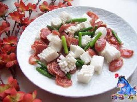 1.先炒腊肠和蒜薹,最后轻轻放魔芋,用木铲温柔地翻,小心不要破坏了魔芋的形状。