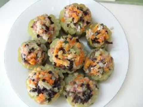 3.将所有菜混合在一起并加盐调味做成馅,将馅装入去囊的苦瓜里后装碟。