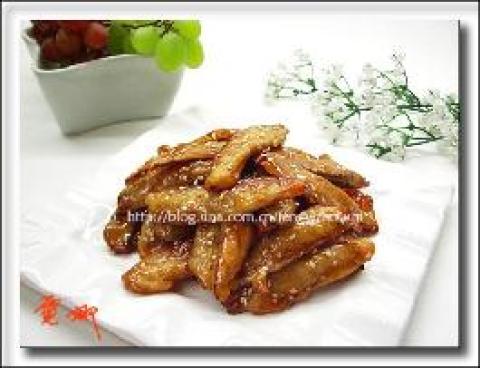 5.另起锅,烧热一匙素油,把调味料放入拌炒至起泡沫时推入牛蒡回锅翻炒,待调味料均匀沾裹牛蒡即关火,撒白芝麻,拌匀即可出锅.