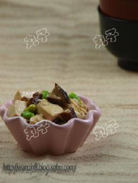 南豆腐1块,干香菇6朵,毛豆1两,蚝油1大匙,盐