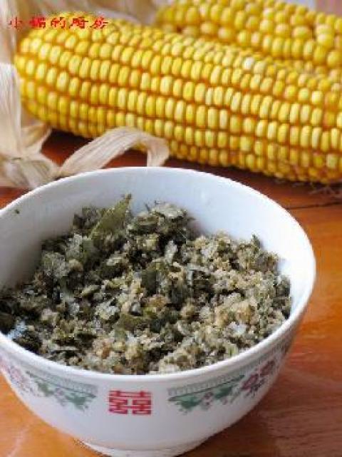3.把切碎的花生叶子和米粉碎拌匀,放进酸菜坛子里,坛子边沿注入清水封好。十天后花生叶子变酸便可食用