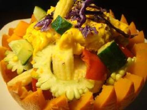2.将南瓜泥和沙拉酱搅拌调匀,先倒1/3的量回南瓜马车内.1/3和所有食材,(刻花下的南瓜也切小块)拌下.