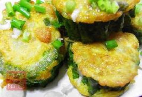 (2)猪肉剁成泥,冬菇,虾切碎,加鸡蛋,面粉,湿淀粉精盐调成馅,塞入苦瓜段,用湿淀粉封两端.