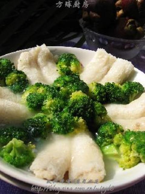 10.将蒸好的竹荪取出,和西蓝花一起摆盘,把盘子里蒸出的汁倒进锅里,加水淀粉和少许盐勾玻璃芡,然后浇到竹荪上。