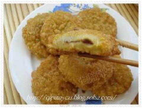 5.锅内倒入足量的油,烧至8成热,放入油糕胚,大火炸至金黄色捞出就可以开吃喽~~