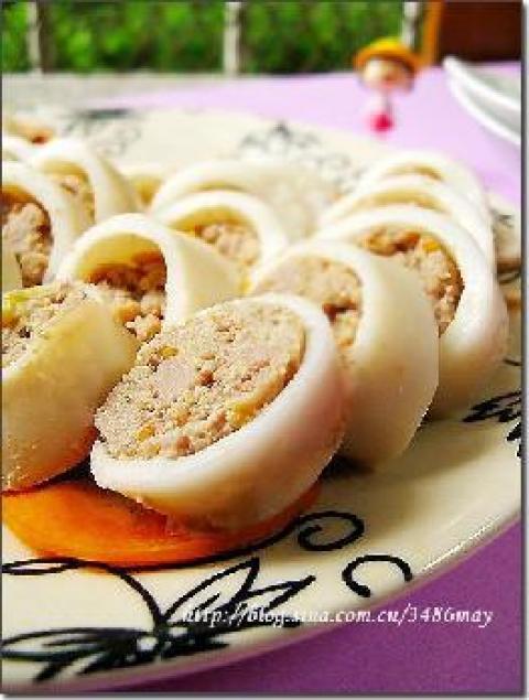 2.塞入洗净的鱿鱼肚子。