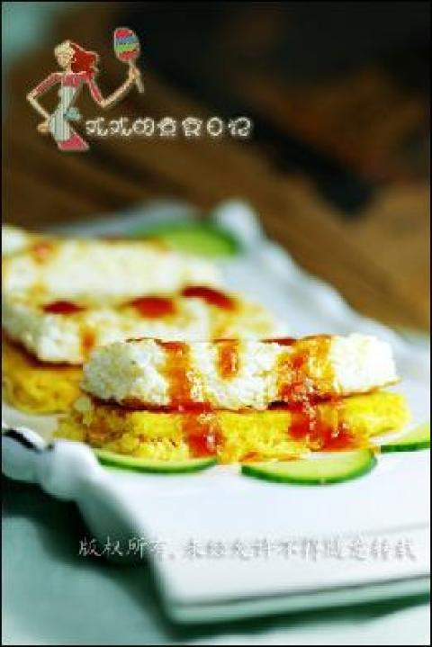 4.分别将马蹄蛋清液和海米蛋黄液煎成白色和黄色两个蛋饼。