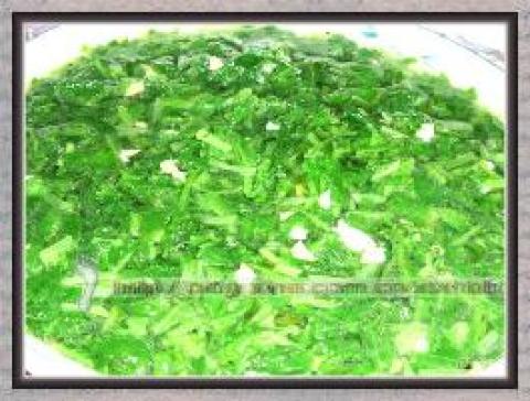 3.另支一锅油烧热放入蒜烧香,倒入切好的萝卜叶加盐翻炒;