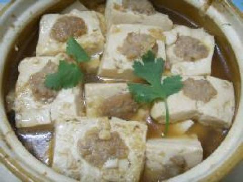 2.豆腐切成方块,用小茶匙在中间挖个小洞,把肉馅填在中间.