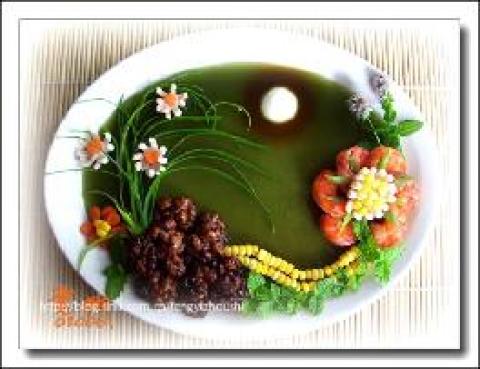 1.将绿茶粉糖水加琼脂(大洋菜)小火煮融化后注入盘子,把煮好的鸡蛋顶上的蛋白部分切下,趁琼脂水尚未凝固就放在自己认为合理的位置,待凉,即制成背景. 云晕是自然的衔接而成,我自己非常满意这个效果.