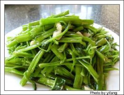 2.热锅凉油将蒜头爆香后加入空心菜嫩叶翻炒,滴入少量米酒及盐,菜变色后即可出锅。