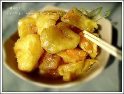4.逐块放入糊内炸至金黄色,炸透捞出,控油。