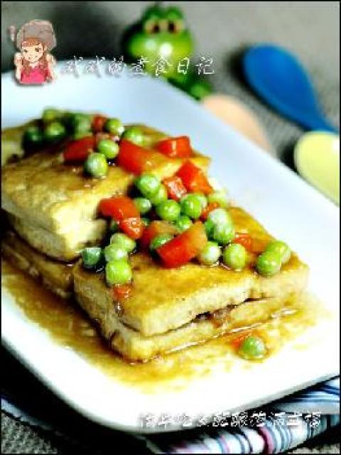 4.在锅里倒入一碗水,没过豆腐夹,加生抽、蚝油开中火炖着,出锅前放青豆和红椒丁即可。