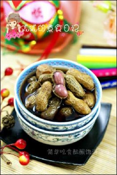 2.锅里放一大碗水,把所有配料放进锅里煮出香味后,下花生,小火煮上半个小时。 关火,倒入陈醋。