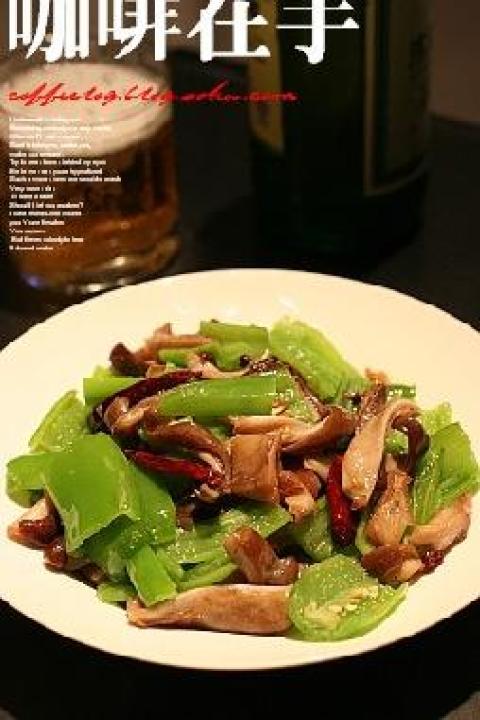 5.炒锅放油,放红辣椒、青辣椒、姜丝、香菇丝爆香,再放肚丝翻炒,加盐、糖、生抽调味,再加麻油、鸡精即可。