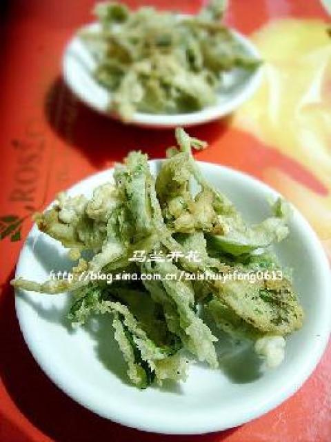 1.用胡椒粉,盐和面粉加适量水搅拌成面糊.马兰挂糊后,