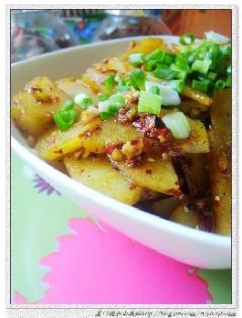 1.土豆去皮,洗净切片。小葱洗净,切好备用。