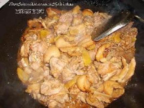 2.将鸭肉放入锅中爆油,这个过程中要不断翻炒。之后加入姜片,直到颜色变深。